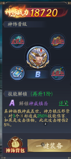其次就是神饰,能够提升天神的品级,最初天神都为C级需要自行升品