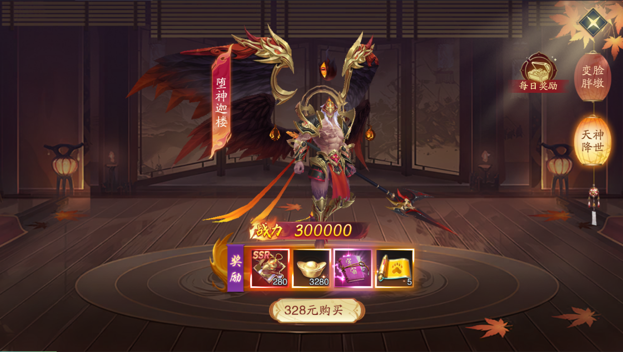 其次就是天神降世以及变脸胖墩两个礼包,前期获取一个SSR天神以及SSR宠物外观,这些属性都是直接加在角色上,而天神能够让你前期神挡杀神,平推大部分关卡,越战力挑战也是简简单单的